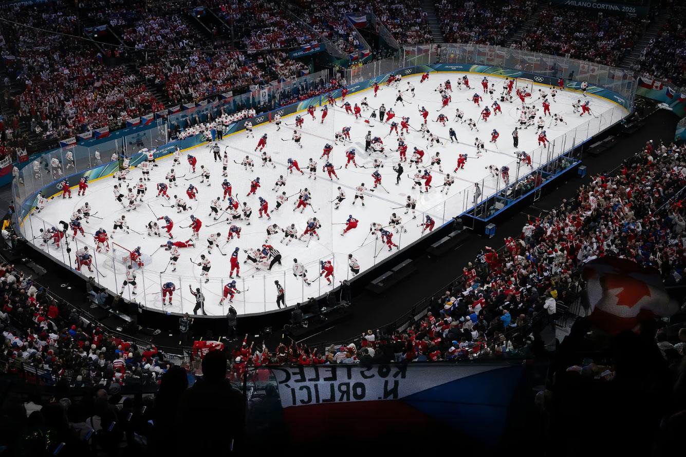 Цифровое составное изображение матча между сборными Чехии и Канады на хоккейной арене «Милано Сантаджулия» 12 февраля 2026 года. (Фото Pauline Ballet):