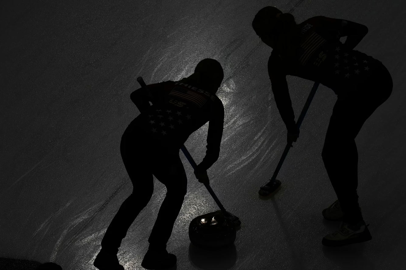 Матч между сборными Дании и США на Олимпийском стадионе керлинга в Кортине 17 февраля 2026 года. Снимки в этой серии были сделаны с помощью винтажных камер Graflex. (Фото Ryan Pierse):
