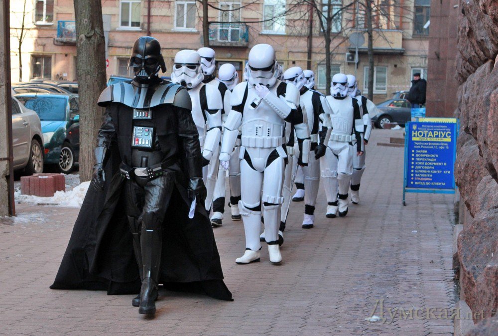 Дарт Вейдер вместе с отрядом штурмовиков решил присоединиться к протесту против запрета «Интернет-партии Украины». Люди в костюмах и масках героев фильма «Звездные войны» пришли к зданию Министерства юстиции. По словам организаторов акции, они намерены принудительно ознакомить главу ведомства Александра Лавриновича с документами, которые подтверждают «полную законность и правомочность существования партии».