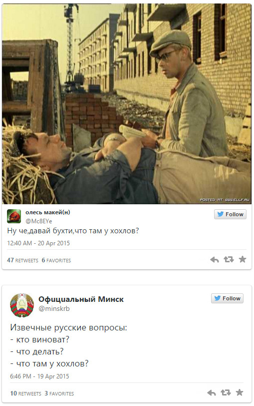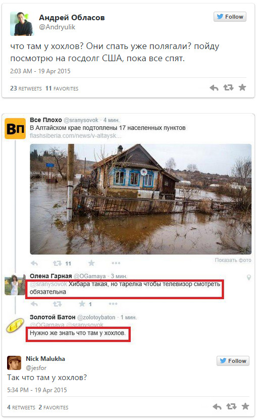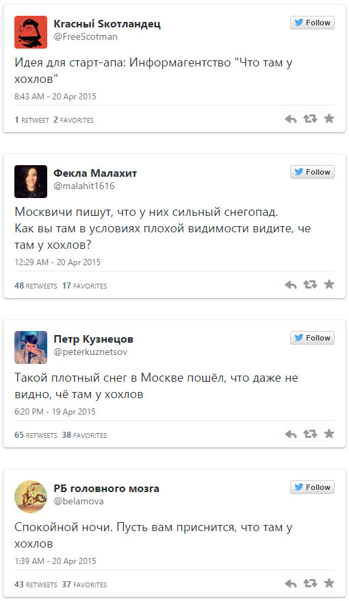 Твиттеры многих российских СМИ регулярно получали ответы, в которых читатели просили им рассказать «что там у хохлов» вместо повестки дня.