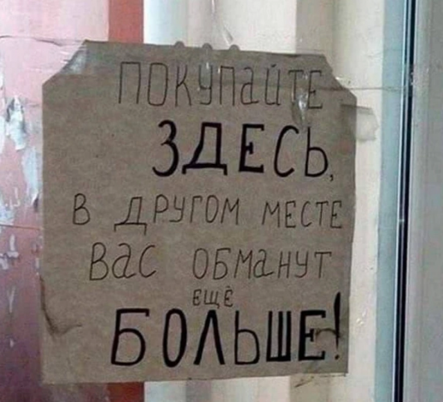 «Сегодня попалась очередная забавная оконная вывеска в городе. Сначала задумался, что это значит. Разгадка обнаружилась в 50 метрах»
