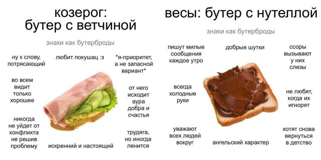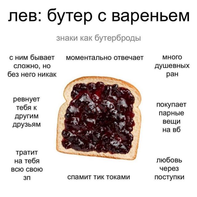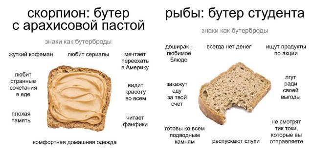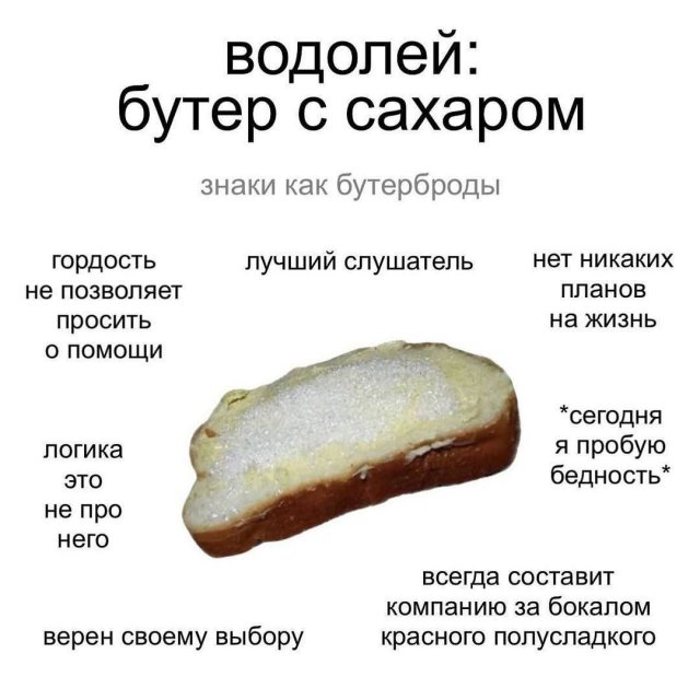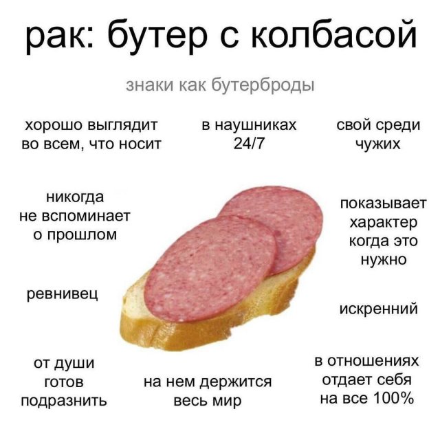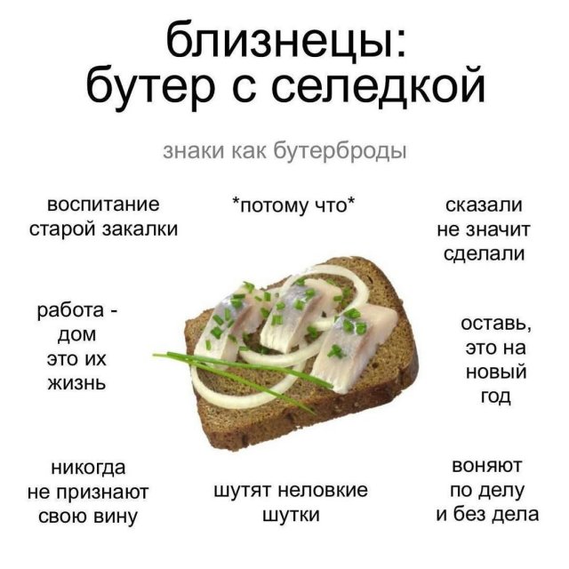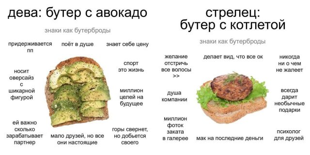 Какой вы бутерброд по знаку зодиака 28/11/2024 14:00 Ну что ж. Настало время важной и серьезной информации. У граждан появилась возможность узнать, какой они бутерброд по знаку зодиака. Наконец-то! Проверяйте, угадали ли астрологи? Главная / Юмор -6 Admin 0 240