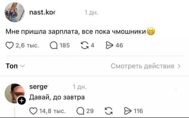 Лучшие мемы и шутки из интернета 😅 17/03/2026 09:00 Судя по всему, "Телега" находится на грани исчезновения, но у нас все еще есть время и возможность надеяться на то, что все обернется к лучшему. А пока давайте уделим внимание шуткам, мемам и всему, что связано с этой темой. Главная / Юмор -1 Admin 0 193