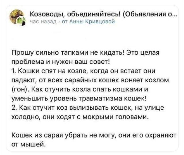 У кого-то тут серьёзная вражда с... козлами и котами. Что происходит — загадка. Кто-нибудь уже вызывал психолога? Или все ушли в отпуск? Спасите человека, он явно перегорел.