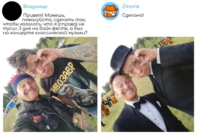 Zinoink продолжает помогать своим подписчикам и исправлять фотографии, которые ему присылают на "обработку". Давайте поглядим на новые снимки довольных клиентов.