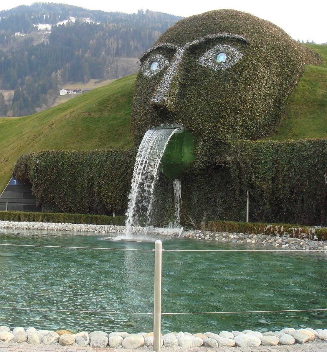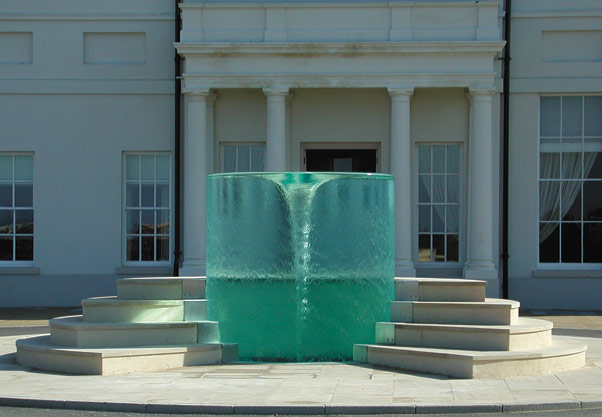 Со стороны это изобретение выглядит как воронка воды, зависшая прямо в воздухе. Эффект достигается так: в основе скульптуры лежит прозрачный акриловый цилиндр, вода внутри которого циркулирует по кругу, создавая посередине воронку. Ее можно наблюдать как сбоку, так и сверху фонтана.