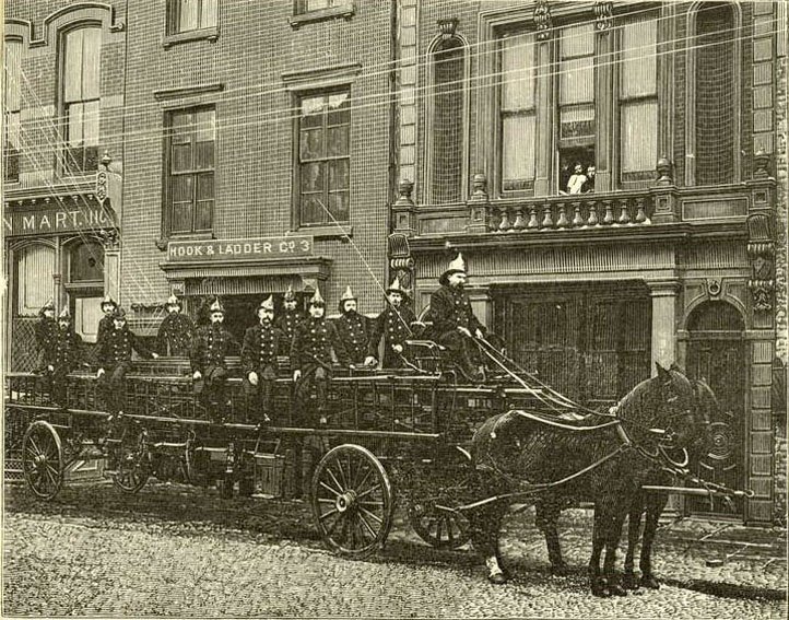 3. Выезд пожарной команды, 1887 год. Повозка такая длинная не из прихоти, а потому, что на ней уложены составные лестницы и многометровые багры с крючьями.
