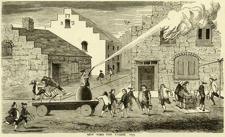 2. Тушение пожара, 1733 год. Люди по цепочке передают полные вёдра и сливают воду в бункер насосной повозки. На повозке, сменяя друг друга, сильные мужики неутомимо качают насос. Присоединенная к насосу поворотная "водоливная труба" с зауженным концом выбрасывает струю воды на 5-7 метров. Высотных домов тогда не было, так что дальнобойности более или менее хватало.