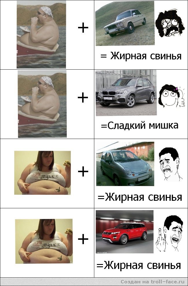 А если парень видит толстую девушку в дорогой тачке, то бесится от того, что не может понять почему у ТАКОЙ есть то, чего у него нет. Была бы хорошенькая, так ясно же - насасала, а тут...как так! Что не правда!
