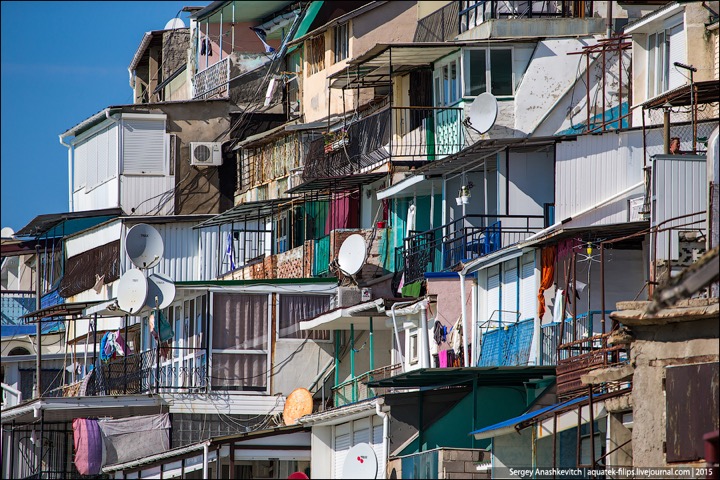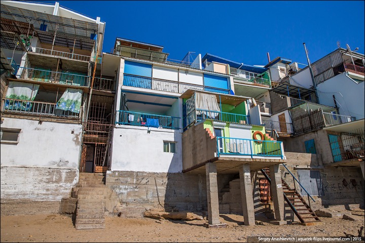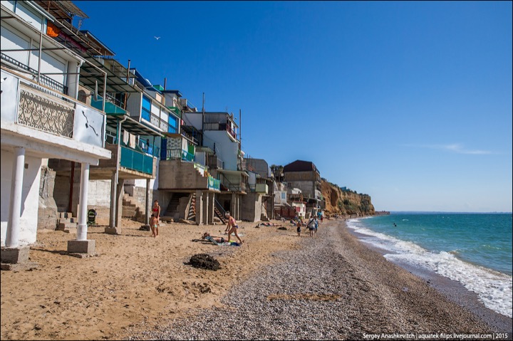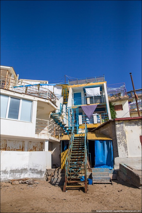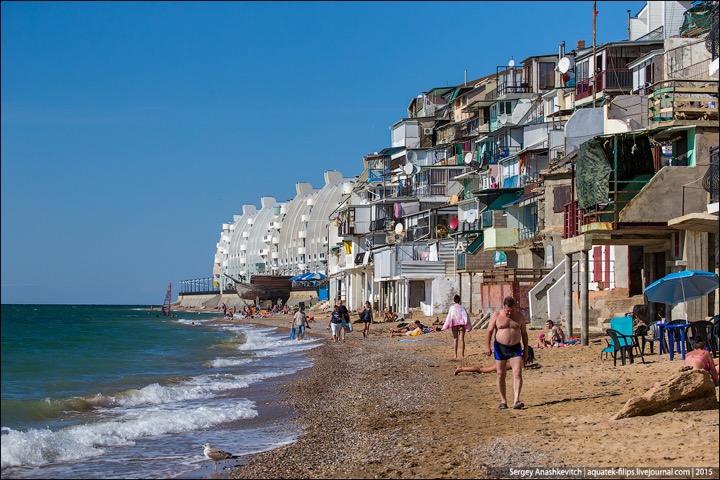 Наткнулись в ЖЖ aquatek-filips на интересные фотографии. Речь в заметке идет о том, что в Крыму власти наконец нашли в себе силы снести так называемые "Матросские дачи" под Севастополем. А по факты эти дачи – жуткого вида капитальные халупы, построенные в 5-10 метрах от линии прибоя. И все эте помещения сдаются отдыхающим в сезон как элитное жилье. Элитность номеров не в том, что в ведро ходить надо, а в том, что открыл стальную дверь – и ты уже на пляже. Стоимость аренды – $30-50 в сутки. Желающих было хоть отбавляй. Но в этом сезоне про бизнес придется забыть – туда уже выезжают экскаваторы...