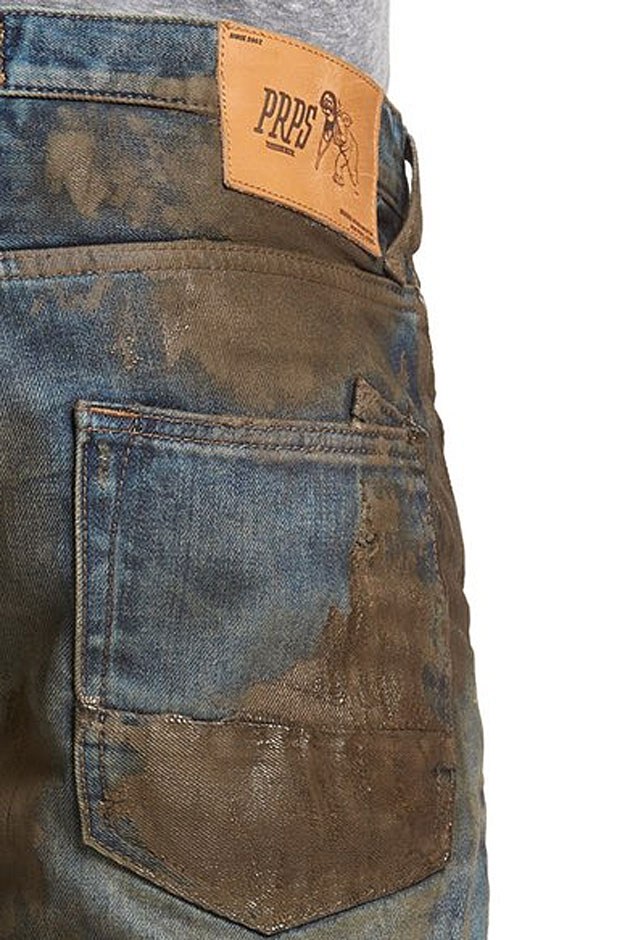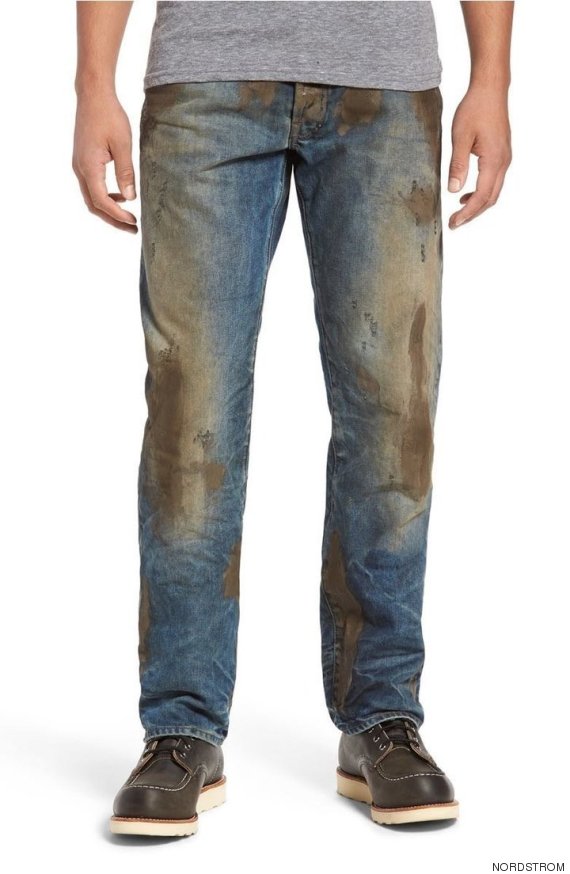 Джинсы вообще любят портить. Всякие дырки, потёртости, пятна краски, неожиданные заплатки – всё это их только украшает (многие так считают). Но вот сеть магазинов Nordstrom переплюнула всех. Там появились джинсы, которые как бы испачканы вот такой дорожной грязью. Грязь, разумеется, искусственная, нанесена таким образом, что не смывается и не отстирывается. Выглядит очень натурально, будто человек минут 15 назад мордой в лужу шлёпнулся и немного в луже покрутился.