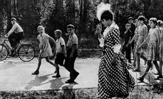 Татьяна Самойлова на прогулке в перерыве между съёмок «Анны Карениной», окружённая толпой зевак младшего и среднего школьного возраста