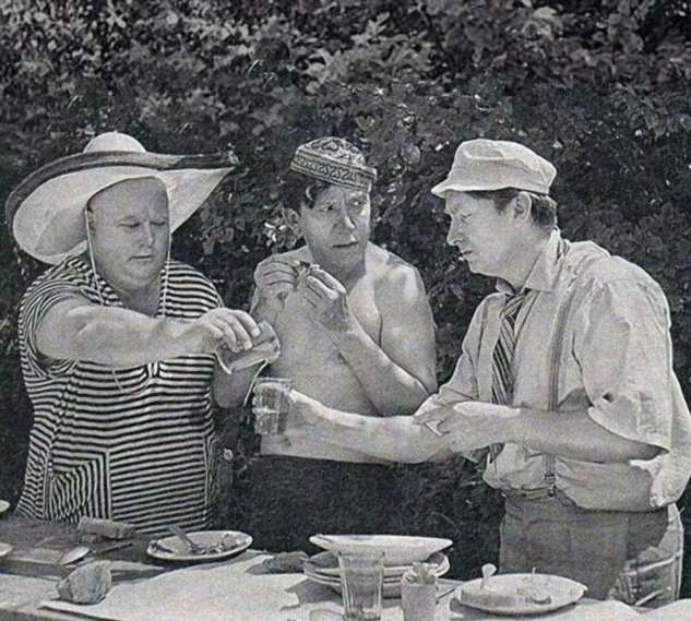 Судя по выражению лиц, из образа никто в перерыве не выходил. Кстати, Вицин никогда не пил, значит можно точно сказать, что в стаканах вода или сок.