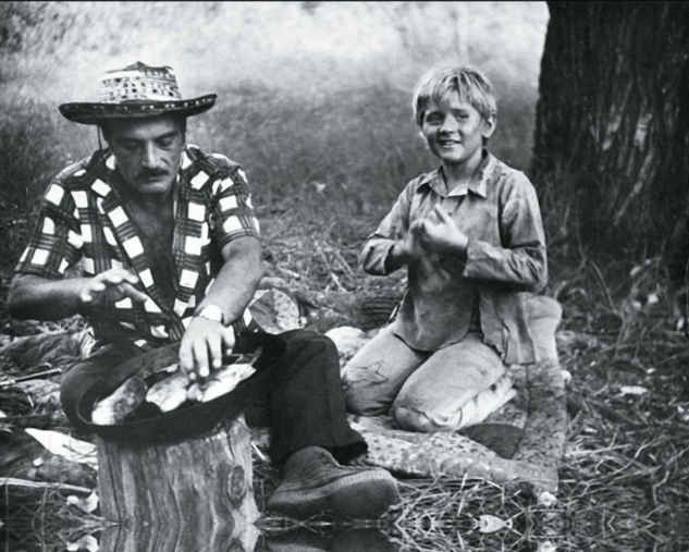 Георгий Данелия ест жареную рыбку с маленкьим Романом Мадяновым на съёмках фильма «Совсем пропащий»