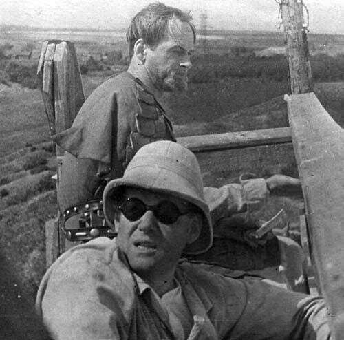 Сергей Эйзенштейн в пробковом шлеме и чёрных очках и Николай Черкасов за кадром «Александра Невского»