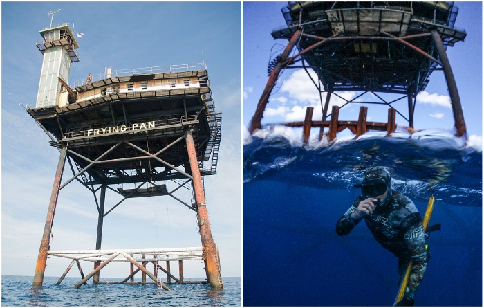 Огромную металлическую площадку среди Атлантического океана местные жители называют сковородкой («The Frying Pan Tower», США). | Фото: atlasobscura.com/ explore.org.