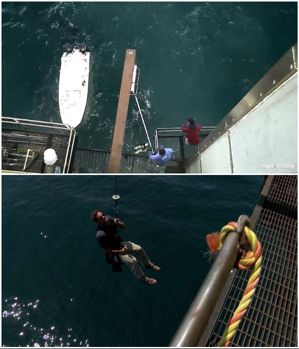 Путешествующие катером на платформу отеля попадают только таким образом («The Frying Pan Tower», США). | Фото: divebuddy.com/ facebook.com/ © Frying Pan Tower.