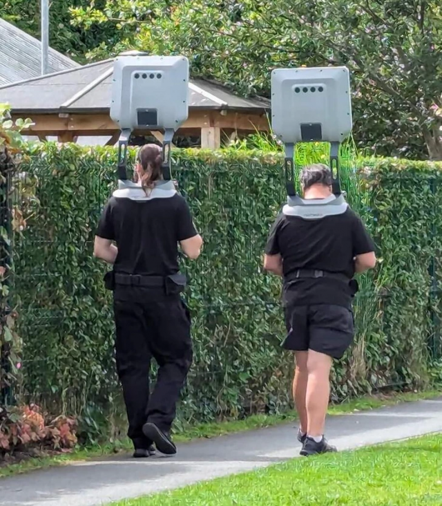 Два мужика с какими-то телевизорами на плечах. Они что-то сканируют?