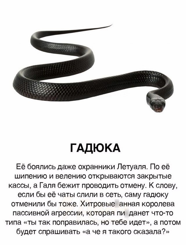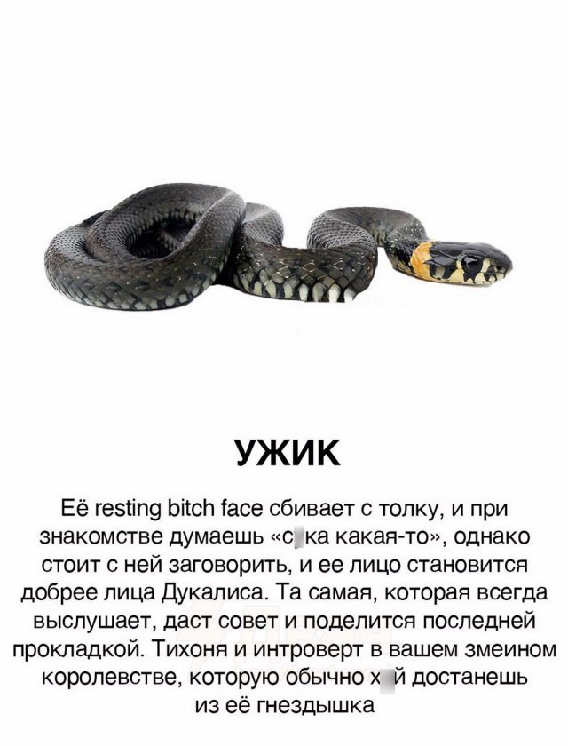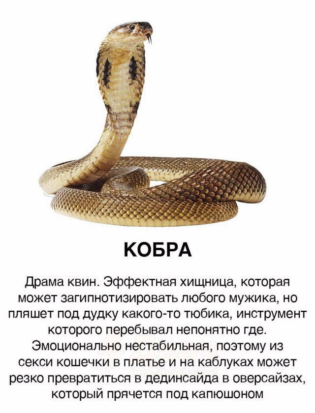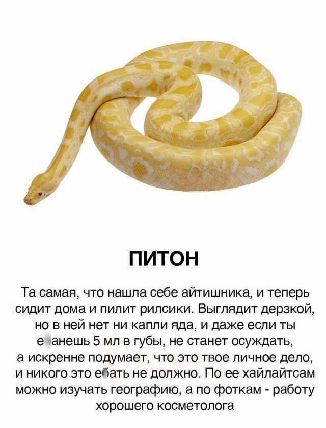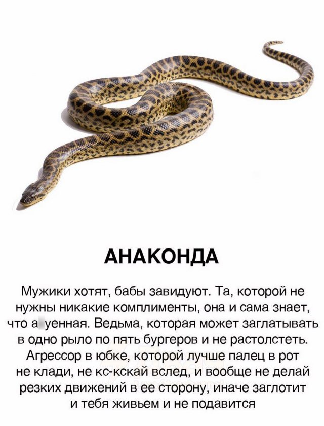 Девушки и змеи: новое сравнение 06/01/2025 22:40 Вы, наверное, видели массу классификаций, где сравнивают мужчин с животными. Но вот теперь настал черед девушек. В интернете появилась забавная аналогия, в которой дам сравнивают со змеями. Давайте посмотрим, что из этого получилось. Главная / Картинки +1 Admin 0 110