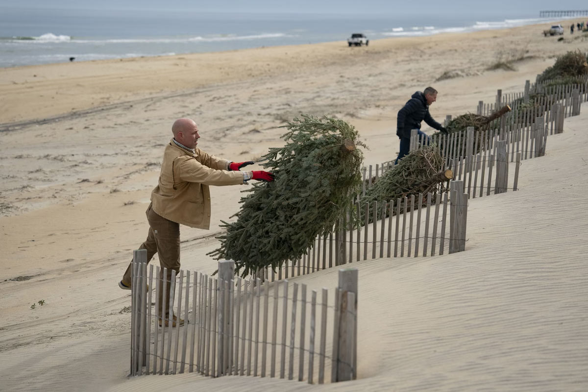 Размещение рождественских елок на дюнах сокращает количество деревьев, отправляемых на окружную свалку, и помогает укрепить дюны. Деревьям требуется от 3 до 6 месяцев, чтобы естественным образом зарыться в песок, который сдувает берег. Волонтеры Better Beaches OBX устанавливают переработанные рождественские елки на дюнах, чтобы восстановить пляж в Китти-Хок, Аутер-Бэнкс, Северная Каролина. (Фото Allison Joyce / Anadolu):