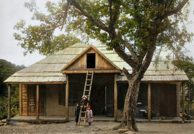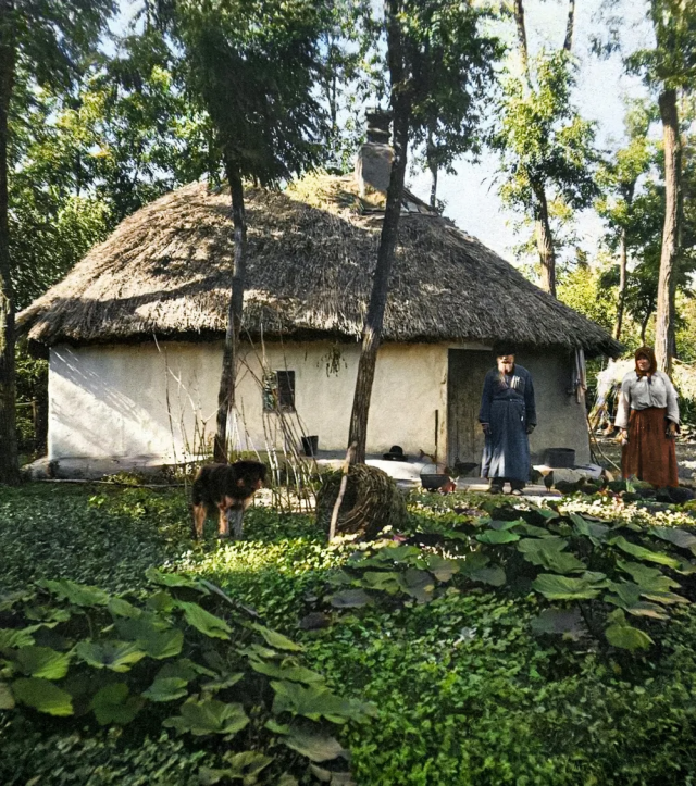 Дома в то время строили из местных строительных материалов: глина, камыш, солома, хворост. В предгорных районах использовался деревянный брус. Хата на фотографии была построена в 1841 году.