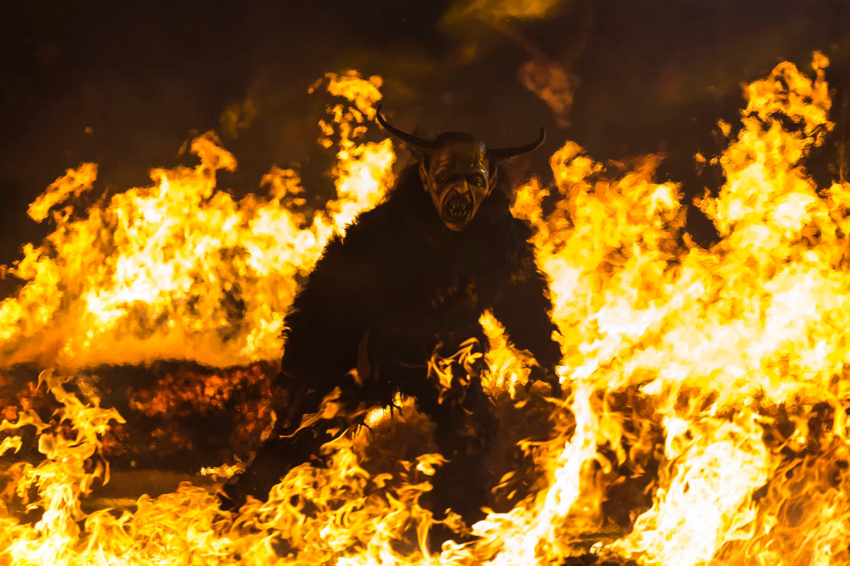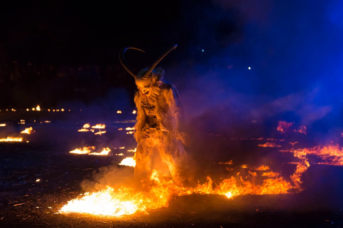 Артист в костюме Крампуса проходит над огнем во время ночи Крампуса в Тарвизио, Италия. (Фото Jurkos):