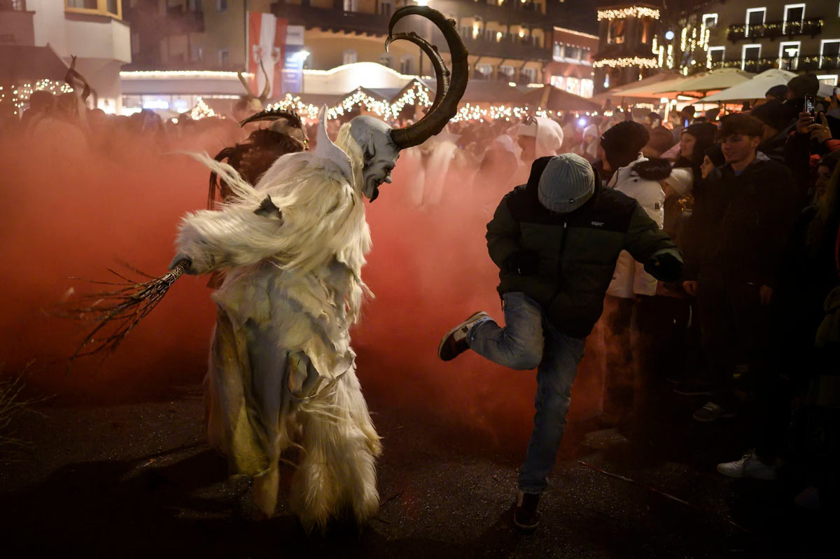 Актеры в костюмах Крампуса преследуют прохожих во время ежегодного парада Крампуса в Зеефельде, Австрия. (Фото Philipp Guelland):