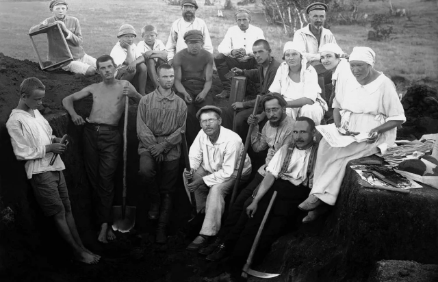 О фотографии: Первый исследователь археологических памятников в районе озера Смолино Николай Минко в 1906–1911 годах в радиусе 25 верст от Челябинска выявил 800 курганов, из которых сам раскопал 100 (до 1914 года). Сотрудники Челябинского музея и члены Общества изучения местного края за 1924–1925 годы раскопали еще 15. К 1925 году на берегу озера Смолино была найдена мастерская человека каменного века, которая полностью перенесена в экспозицию местного музея. В первом ряду сидят: Сергей Орлинков, Сергей Дурылин; во втором ряду – А. Ф. Сурьянинова, М. А. Минко, И. А. Комиссарова (?); в третьем ряду М. В. Максимов (в тюбетейке).