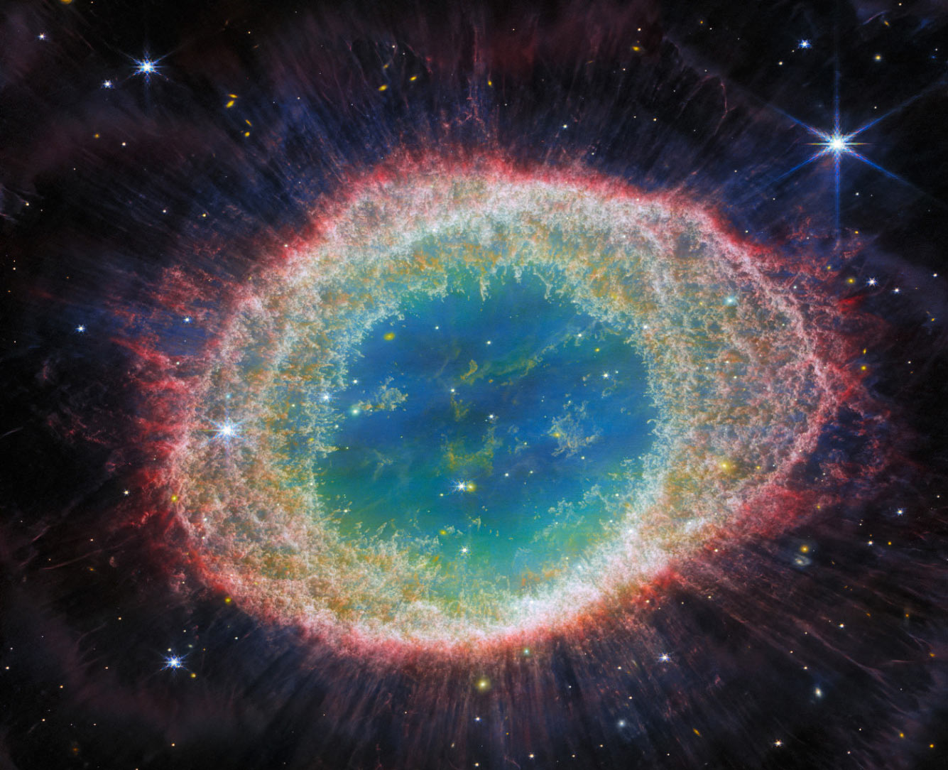 Планетарная туманность Кольцо в созвездии Лиры, она удалена на 2300 световых лет от Земли. В центре туманности расположен белый карлик, который был ядром звезды, пока та не сбросила оболочку. Перед этим звезда была похожа на Миру Кита, а её масса составляла порядка одной массы Солнца. Яркая оболочка туманности расширяется со скоростью 20—30 км/с, сейчас её диаметр составляет 0,9 световых лет.