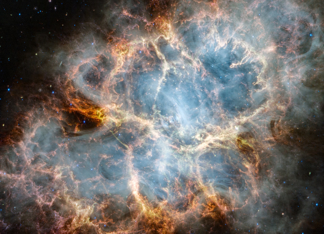 Газообразная Крабовидная туманность в созвездии Тельца. Расположенная на расстоянии около 6500 световых лет (2 кпк) от Земли, туманность имеет диаметр в 11 световых лет (3,4 пк) и расширяется со скоростью около 1500 километров в секунду. Туманность является остатками сверхновой, взрыв которой наблюдался, согласно записям китайских астрономов, 4 июля 1054 года. Вспышка была видна на протяжении 23 дней невооружённым глазом даже в дневное время.