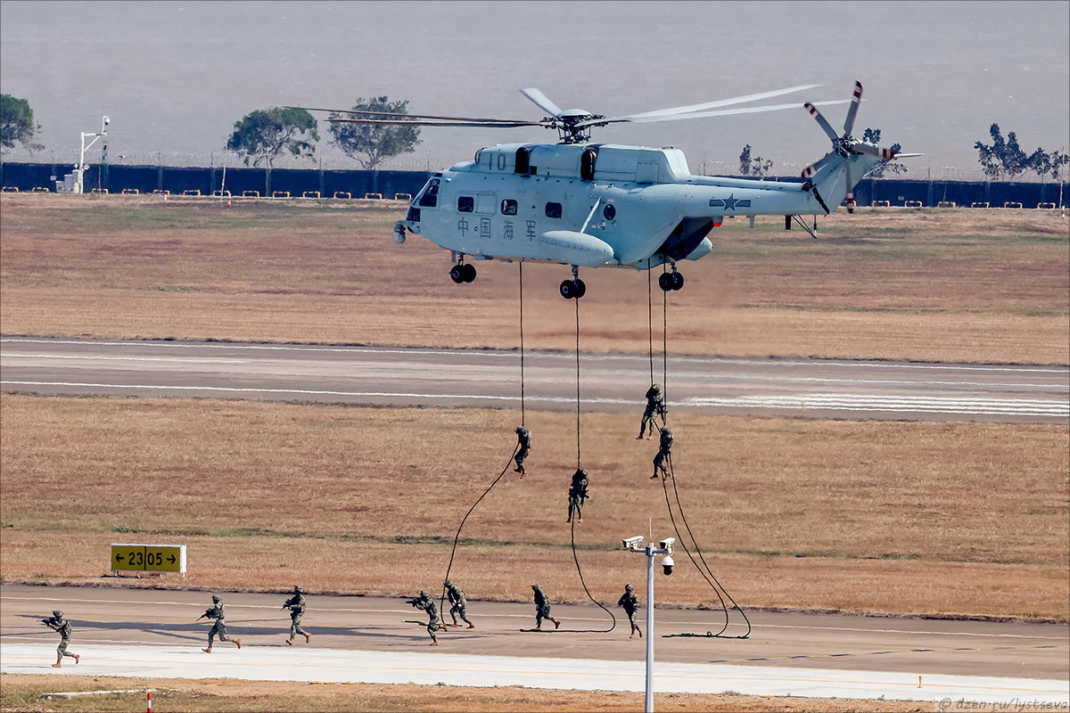 В демонстрационной программе три вертолета осуществляли перевозку на внешней подвески легких десантных машин и высаживали в воздухе отряд морской пехоты. Возможно, так в будущем им представляется высадка на Тайвань… Осуждаем такие милитаристские планы!
