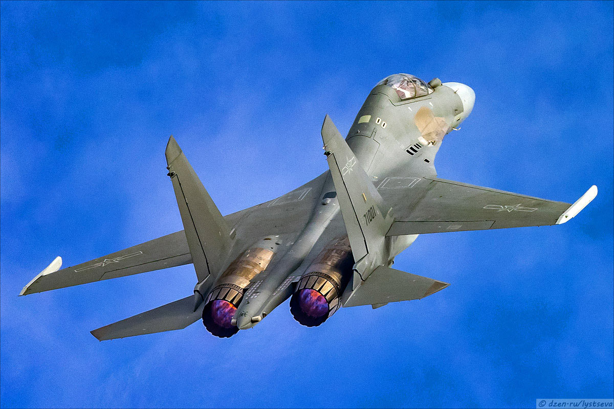 В полёте строем во краям мы видим J-15 (Дзянь-15), копию российского палубного истребителя Су-33, ранний прототип которого Т10К-7 китайцы смогли купить на Украине. Они оснащены подвесным агрегатом заправки (аналог российских ПАЗ-МК) и позволяют дозаправлять другие палубные машины в полёте — к сожалению, российские Су-33 не имеют такой возможности (но так умеют МиГ-29К).