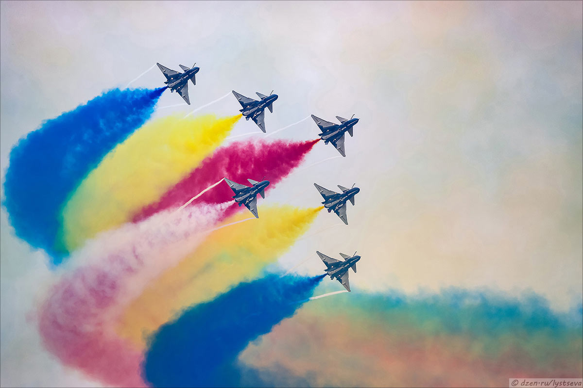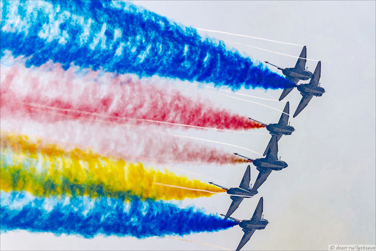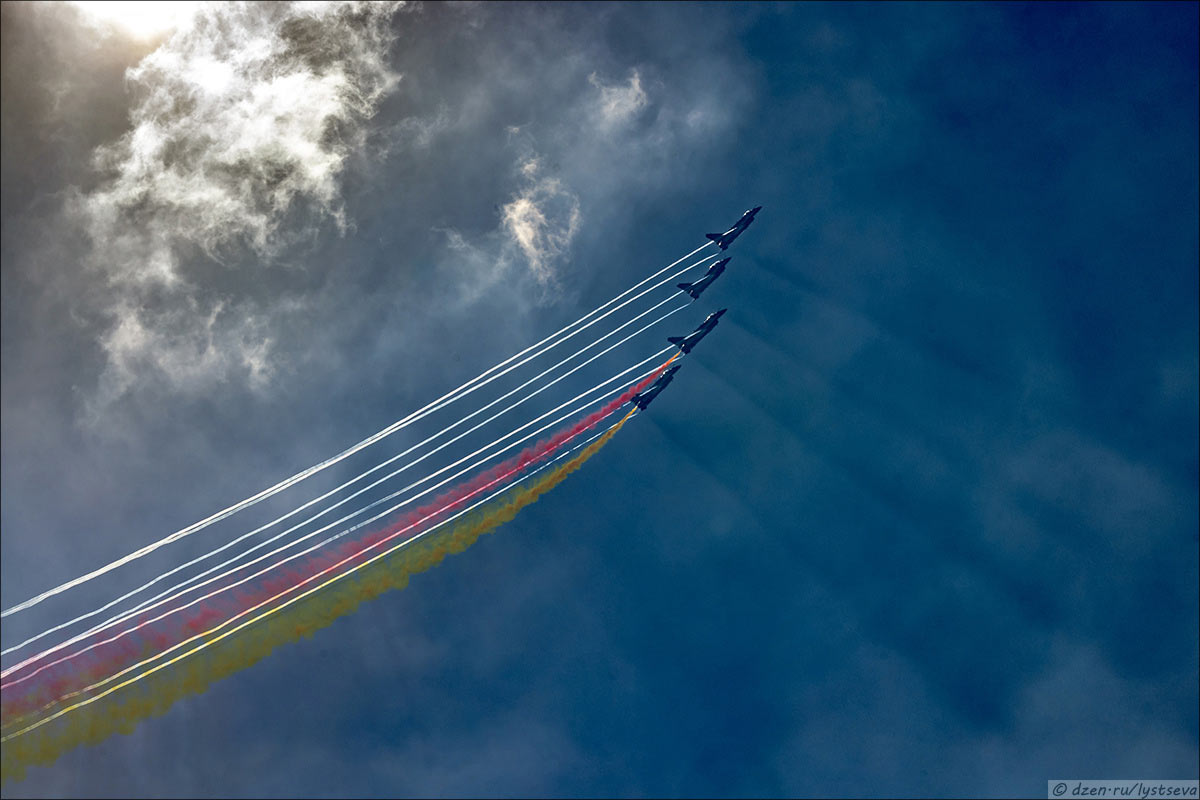 Самолеты выполняли групповой пилотаж как четверкой, так и отдельными парами, но в этот раз не засветили открытыми свои отсеки вооружения.