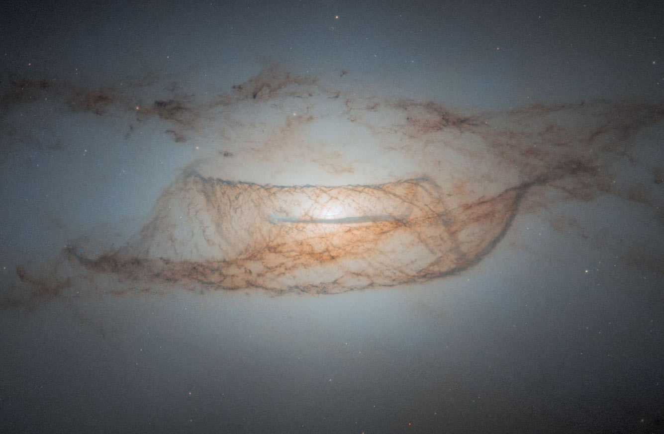 Это снимок галактики NGC 1546, которая расположена примерно в 50 миллионах световых лет от нас, она дает хороший вид на пылевые полосы немного сверху, подсвеченные ядром галактики. Эта пыль поглощает свет из ядра, краснея и делая её ржаво-коричневой. Само ядро ярко светится желтоватым светом, указывая на более старую популяцию звезд. Ярко-голубые области — области активного звездообразования. (Фото NASA, ESA, STScI, David Thilker):