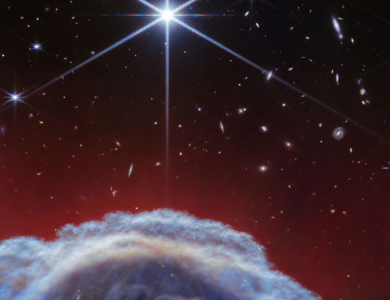 Это изображение с космического телескопа Джеймса Уэбба запечатлело самые четкие инфракрасные изображения туманности Конская Голова на сегодняшний день и ночное небо, полное далеких галактик за ее пределами. На нем показан участок неба в созвездии Ориона, над турбулентными волнами пыли и газа туманности Конская Голова, также известной как Барнард 33, которая находится примерно в 1300 световых годах от нас. (Фото ESA / Webb, NASA, CSA, K. Misselt and A. Abergel):