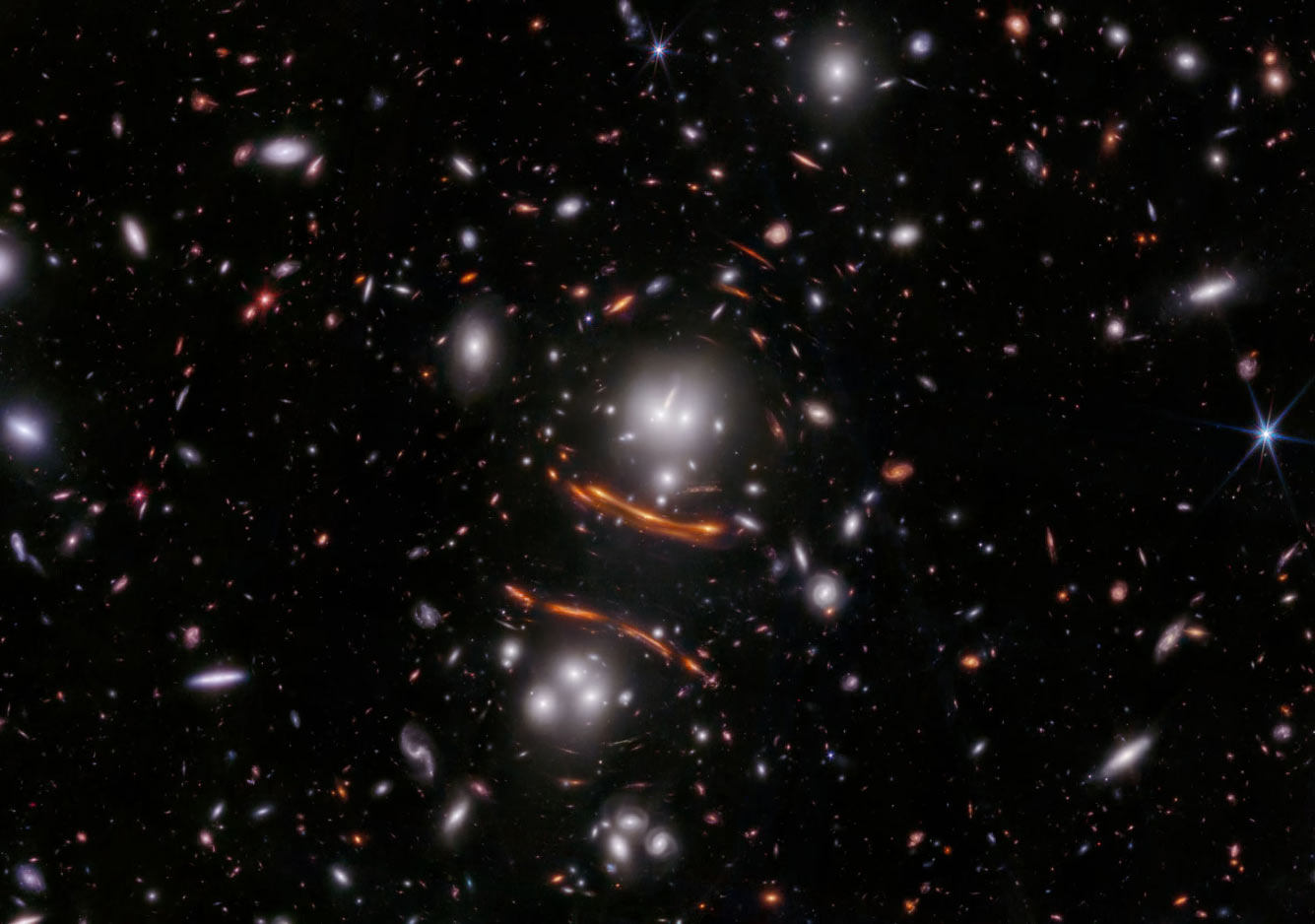 NIRCam космического телескопа NASA James Webb показал галактическое скопление PLCK G165.7+67.0, также известное как G165. На этом изображении – скопление на переднем плане, расположенное в 3,6 миллиардах световых лет от Земли, увеличивает и преломляет свет далекой Вселенной с помощью гравитационной линзы. Астрономы обнаружили удивительный свет сверхновой, изображенной аж трижды, он виден как точки света внутри яркой красной дуги под центром изображения. Чтобы получить три изображения, свет прошел по трем разным путям. Поскольку каждый путь имел разную длину, а свет двигался с одинаковой скоростью, сверхновая наблюдалась в этом снимке в три разных момента времени во время ее взрыва. (Фото NASA, ESA, CSA, STScI):