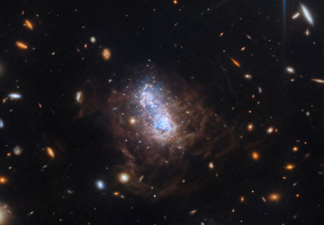 Космический телескоп Джеймса Уэбба запечатлел захватывающий вид галактики I Zwicky 18 (I Zw 18). Эта галактика, находящаяся примерно в 59 миллионах световых лет от нас, является типичной для галактик, населявших раннюю Вселенную, и классифицируется как карликовая неправильная галактика. Две основные области звездообразования встроены в сердце галактики. Тонкие коричневые нити, окружающие центральную область звездообразования, представляют собой пузырьки газа, нагретые звездными ветрами и интенсивным ультрафиолетовым излучением, высвобождаемым горячими молодыми звездами. (Фото ESA / Webb, NASA, CSA, A. Hirschauer, M. Meixner):