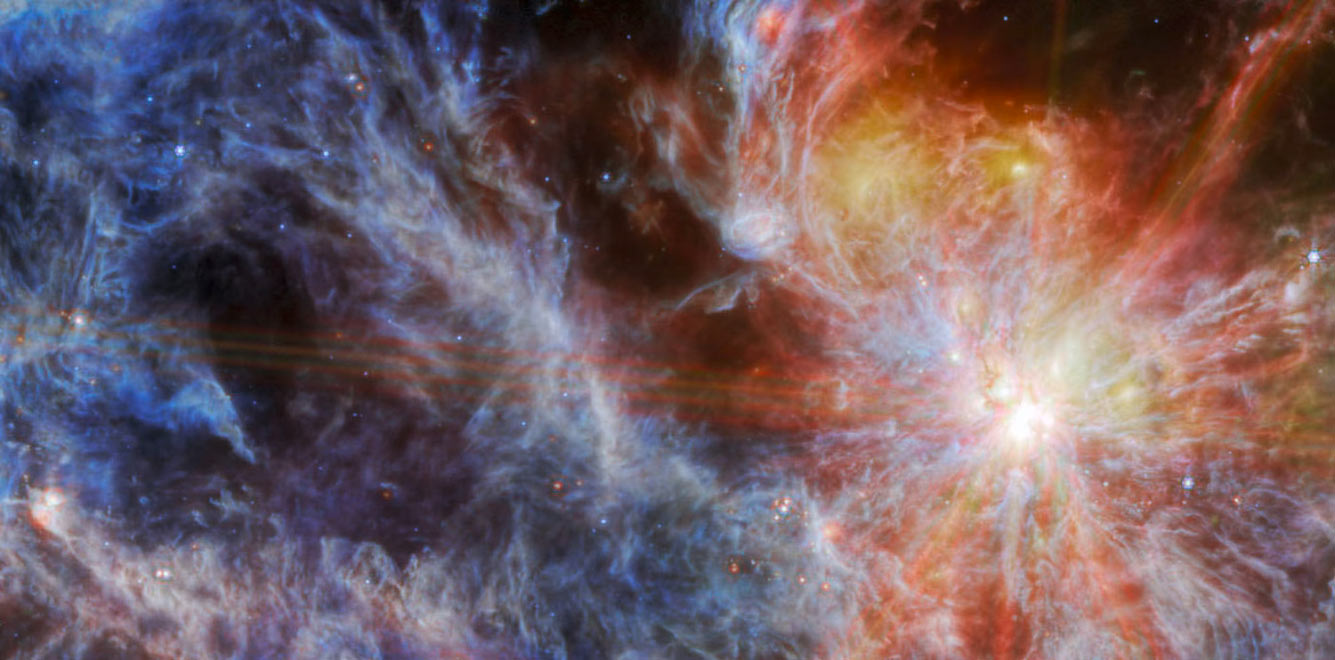 На этом изображении показан центр туманности Змеи, как его видит камера ближнего инфракрасного диапазона космического телескопа Джеймса Уэбба. Туманность Змеи, расположенная в 1300 световых годах от Земли, является домом для особенно плотного скопления недавно образующихся звезд, некоторые из которых в конечном итоге вырастут до массы нашего Солнца. Изображение этой туманности, полученное Уэббом, показывает группу выровненных протозвездных потоков (видно вверху слева). (Фото NASA, ESA, CSA, STScI, K. Pontoppidan, J. Green):
