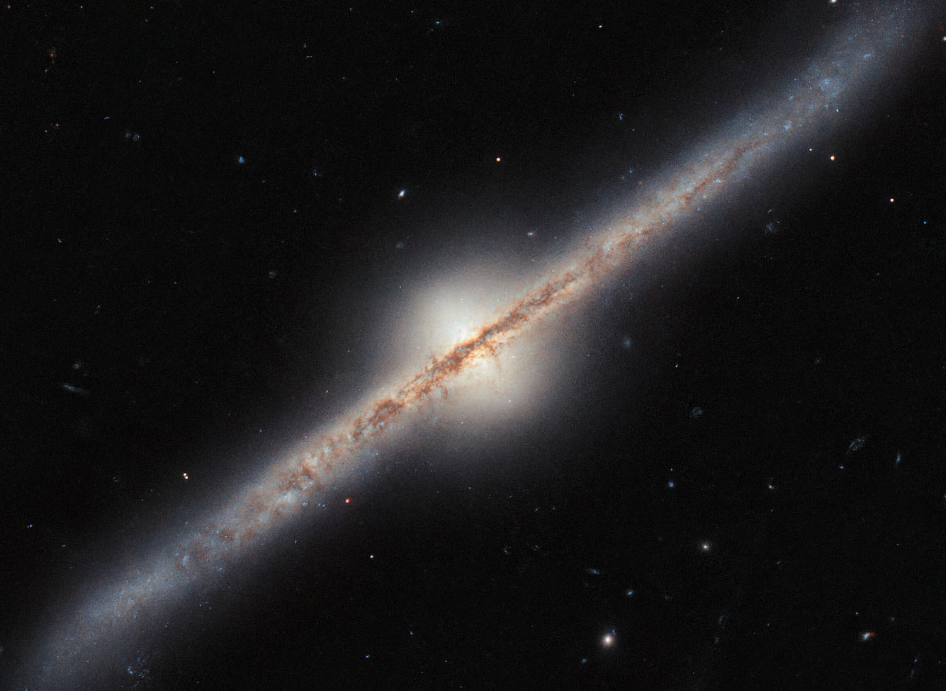 Расположенная примерно в 150 миллионах световых лет от Земли в созвездии Змеи, UGC 10043 является одной из довольно редких спиральных галактик, которые видны с ребра. С этой точки зрения мы видим диск галактики как резкую линию через пространство, покрытую заметной полосой пыли. Можно увидеть огни некоторых активных областей звездообразования в рукавах, сияющие из-за пыли. Поразительно, но мы также можем видеть, что центр галактики имеет светящуюся, почти яйцевидную «выпуклость», возвышающуюся намного выше и ниже диска. Необычно большой размер этой выпуклости по сравнению с диском галактики, возможно, обусловлен тем, что UGC 10043 перекачивает материал из соседней карликовой галактики. (Фото ESA / Hubble & NASA, R. Windhorst, W. Keel):