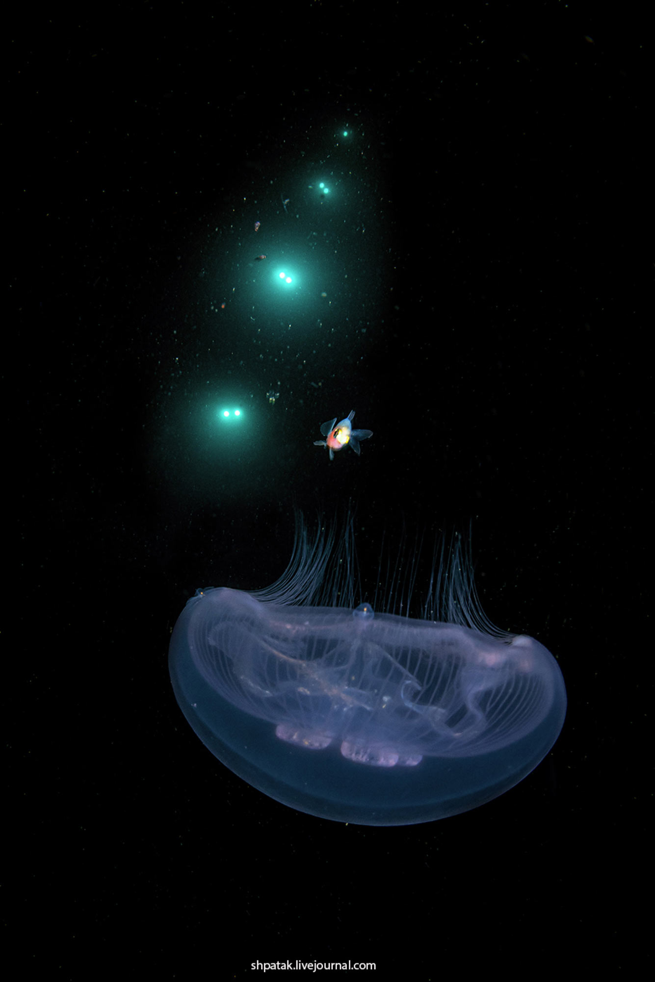 Лунная медуза Аурелия ушастая с маленькой рыбкой на фоне гирляды фонарей черной воды: