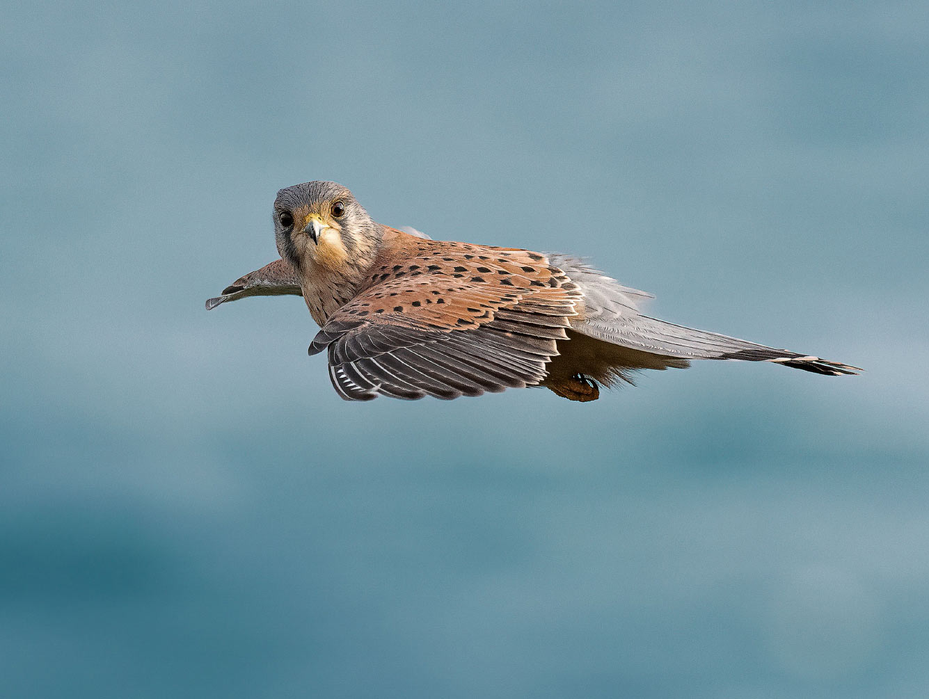 Пустельга бросает взгляд на фотографа, пролетая мимо него в Сент-Айвсе, Корнуолл, Великобритания. Во время охоты пустельга висит в воздухе, часто трепеща крыльями, и высматривает добычу. Заметив мышь или крупное насекомое, она стремительно падает вниз. За день взрослая пустельга съедает около десятка грызунов. (Фото Andy Maher):