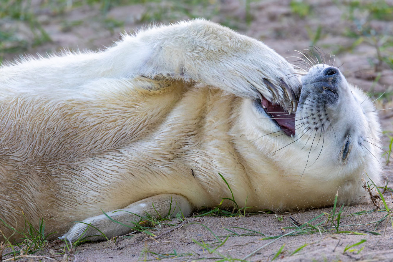 Новорожденный детеныш тюленя на песчаных дюнах природного заповедника Донна Нук Линкольнширского фонда дикой природы недалеко от Гримсби, северо-восточная Англия. Каждый месяц в ноябре и декабре тысячи серых тюленей рожают своих детенышей недалеко от песчаных дюн природного заповедника Донна Нук, где находится одна из четырех колоний серых тюленей на восточном побережье Англии. (Фото Oli Scarff):