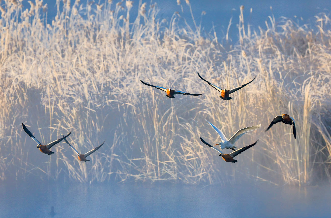 Перелетные птицы летят в живописном месте озера Цяньдаохэ в загородном парке Дахэйхэ в Хух-Хото, Внутренняя Монголия, Китай. (Фото Costfoto/NurPhoto):