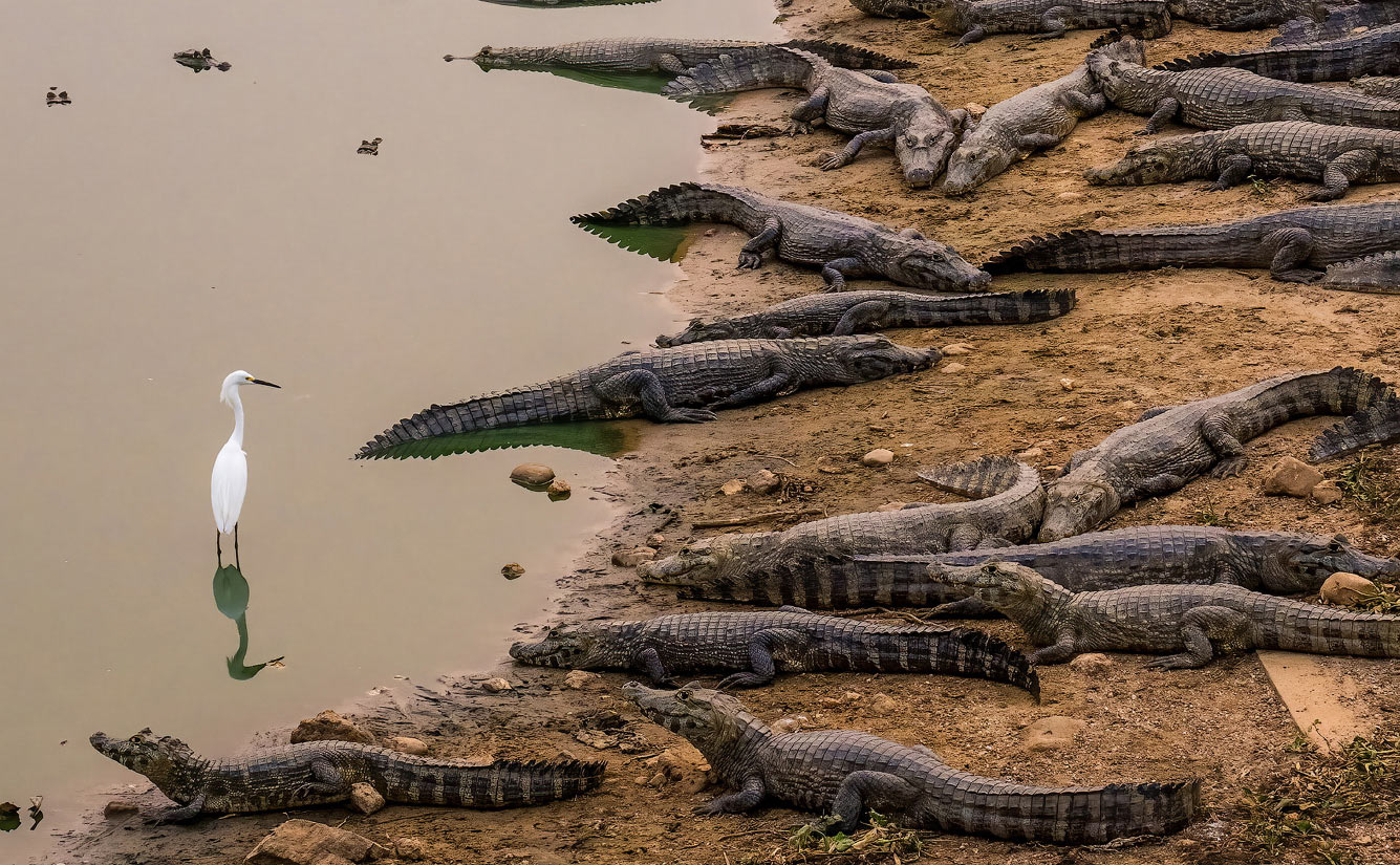 Белая цапля спокойно бродит между кайманами якаре, отдыхающими у водопоя вдоль Транспантанейры, главной дороги, которая проходит через отдаленный район Пантанал в Бразилии. (Фото Peter Batty):