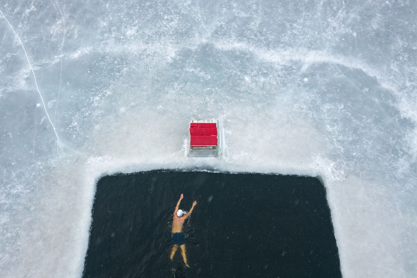 Юй Сяофэн прыгает в бассейн, высеченный изо льда на замерзшей реке Сунгари в Харбине в северо-восточной провинции Хэйлунцзян в Китае. (Фото Andy Wong):