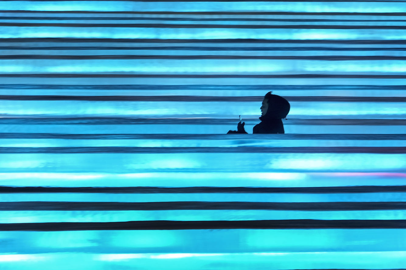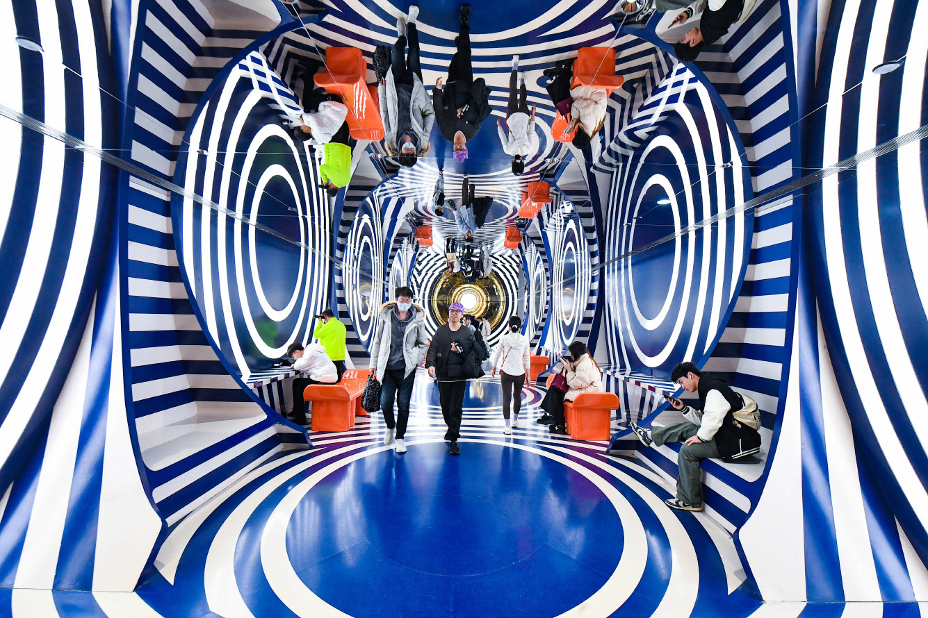 Люди поднимаются на эскалаторе посреди инсталляции барабанов в Пекине. (Фото Jade Gao):