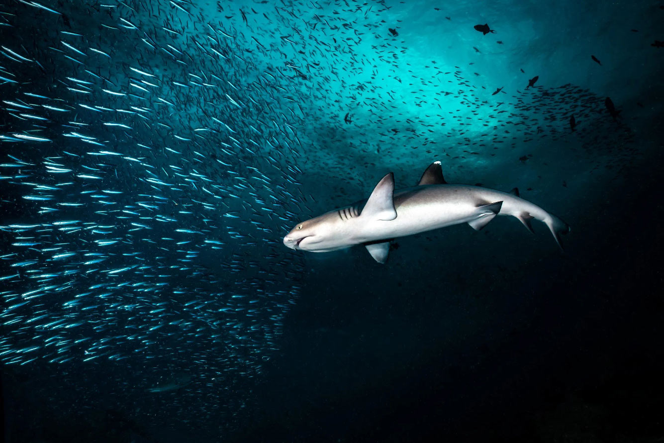 Акула и косяк рыб. (Фото © Marco Lausdei/Ocean Art 2024):