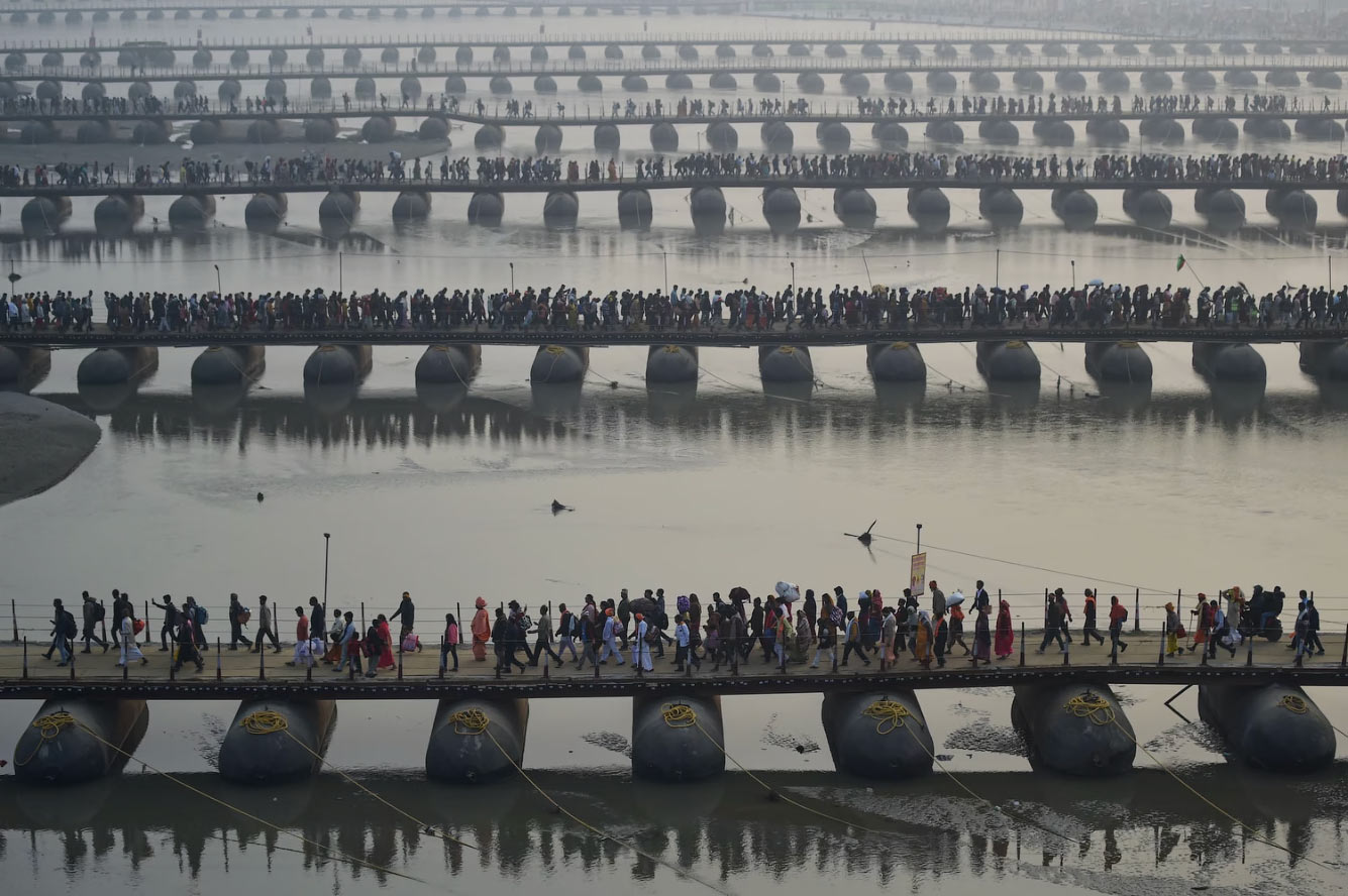 Верующие пересекают временные понтонные мосты через реку Ганг. (Фото Ritesh Shukla):
