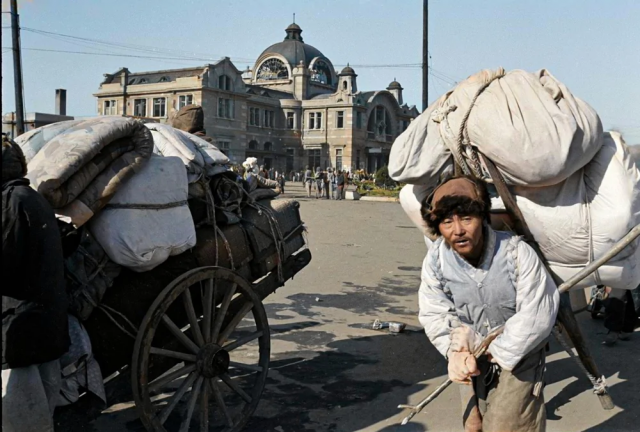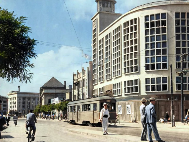 Уличная сцена в столице Кейджо (также известной как Сеул), Корея, 1944 года. Здание на переднем плане — универмаг Mitsubishi.