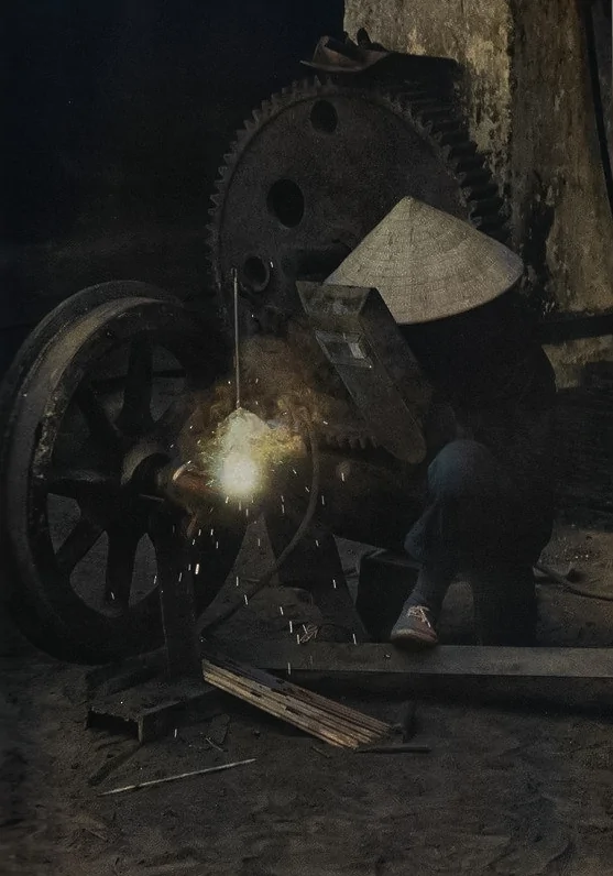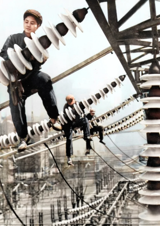 "На высоте". Китай, 1980 год. Китайские женщины выполняют работы по техническому обслуживанию высоковольтных электрических кабелей на электростанции Фушин.